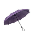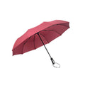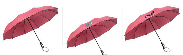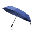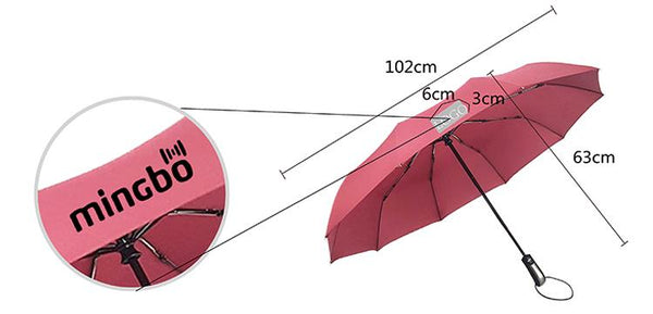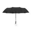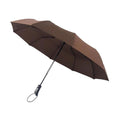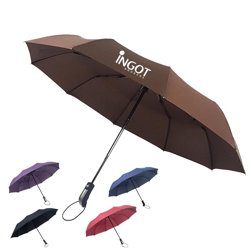 Collapsible triple-folding umbrella with ten ribs, straight handle and wrist strap. Includes automatic open and close function.