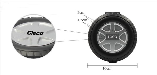 15-piece car tool kit in flip-open case in the shape of a tyre.
