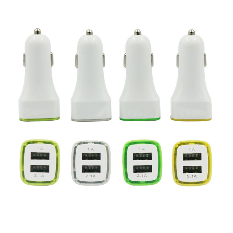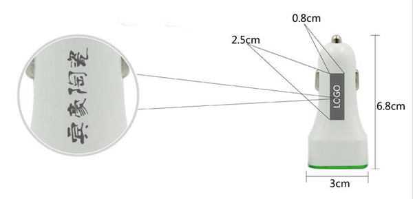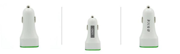 USB charger for cars with light around square head. Includes 2 USB ports.