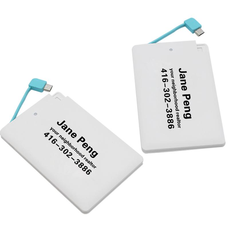 2500 mah card-sized power bank with apple connector.