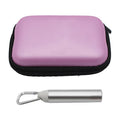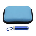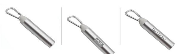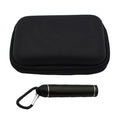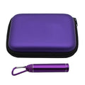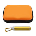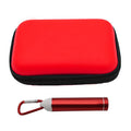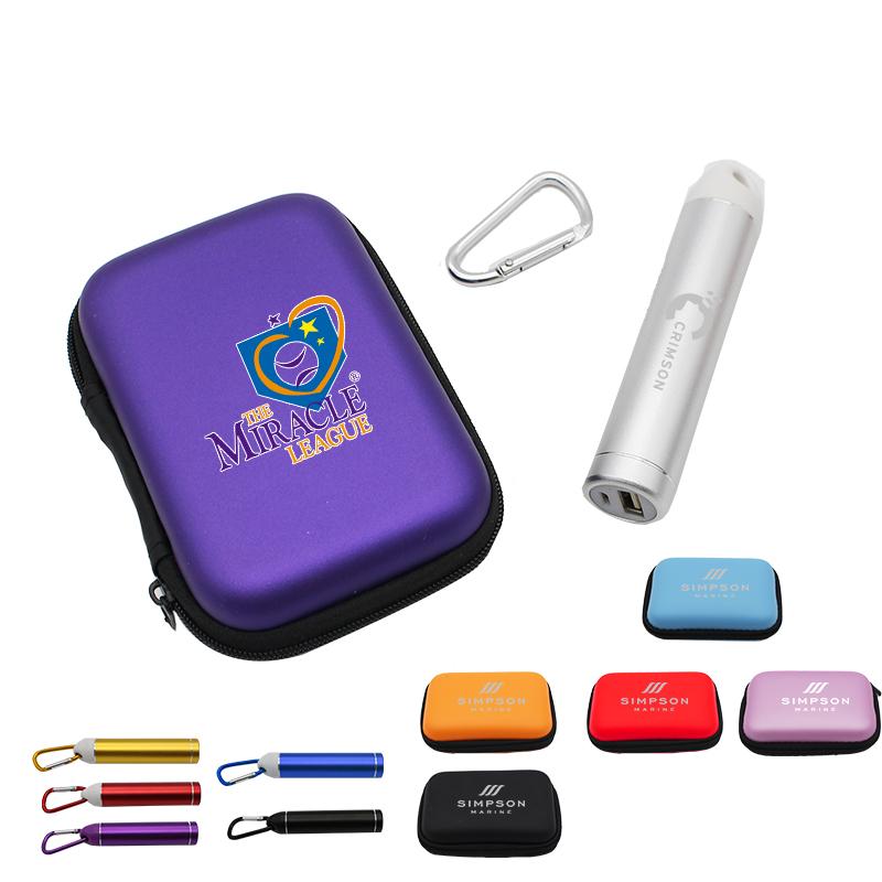 Aluminium portable power bank set. Includes one power bank in the shape of a cylindrical stick, a carabiner, and zippered carrying case.