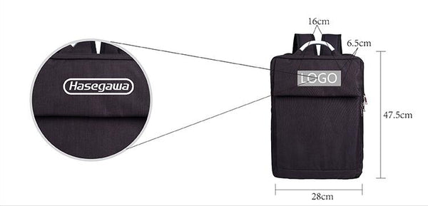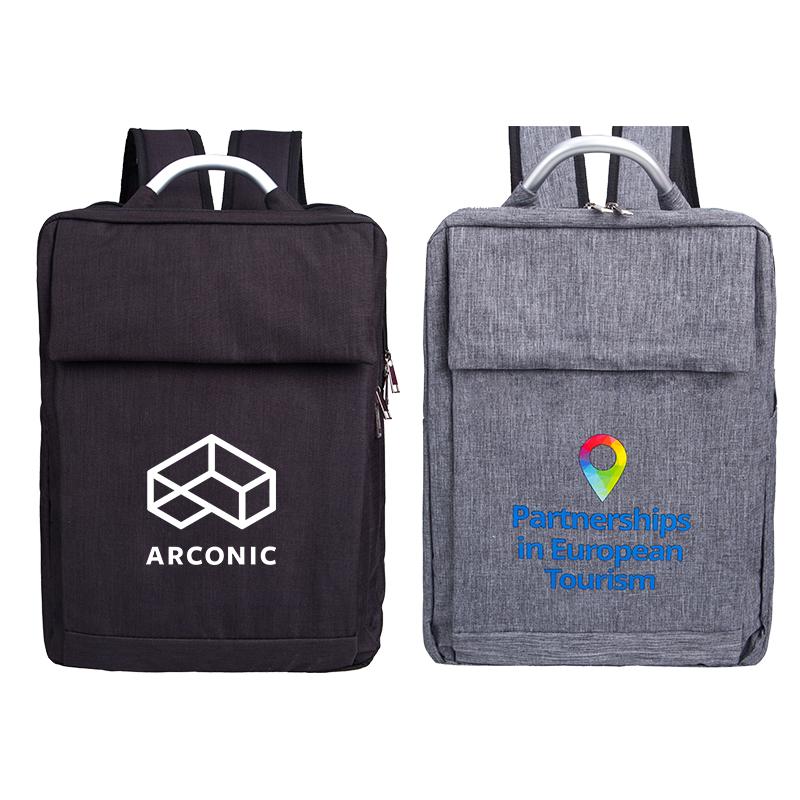 Business laptop backpack for travelling with zippered compartments. Includes metal carrying handle.
