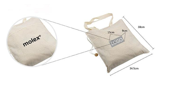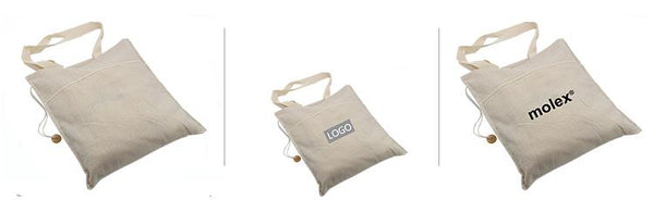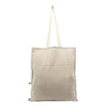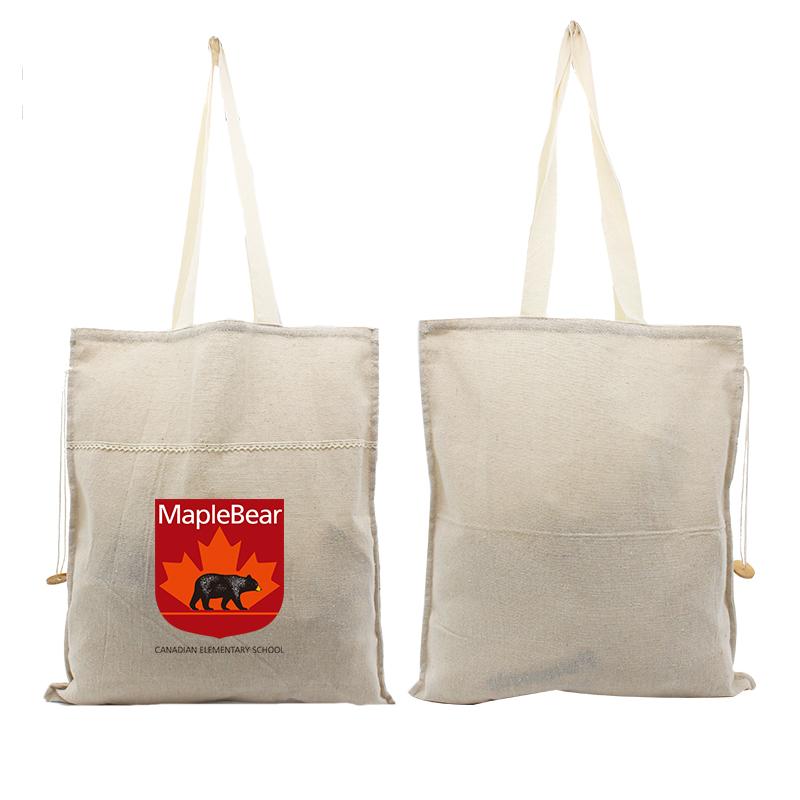 Cotton Tote bag with carrying handles and drawstring closure.