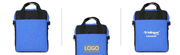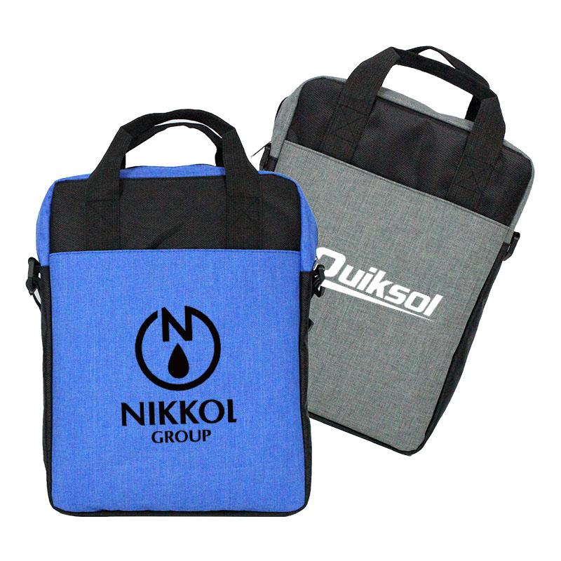 Dual-coloured office document bag with carrying handles and shoulder straps.