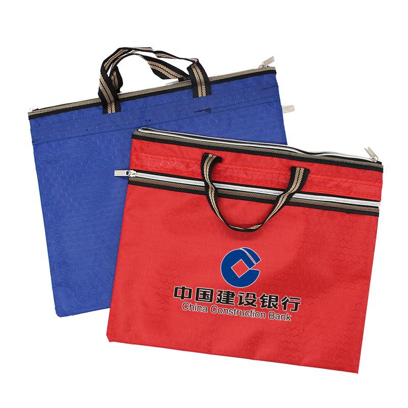 Rectangular tote bag in hexagonal patterned Oxford cloth with carrying handles and zippered closure. Includes external pocket with zip.
