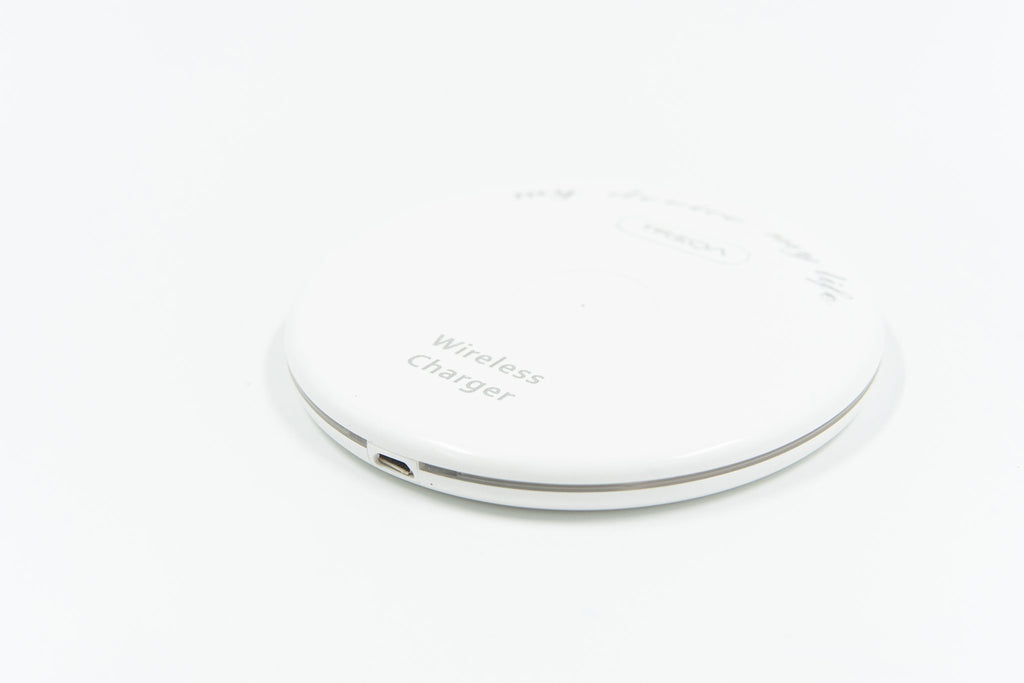 Wireless charging pad for mobile devices. 5W, 1 Amp power transfer rating. Comes with Micro USB cable.