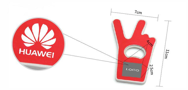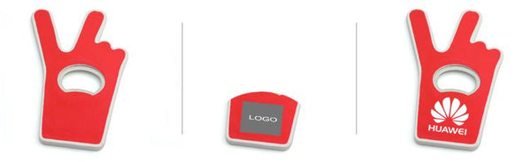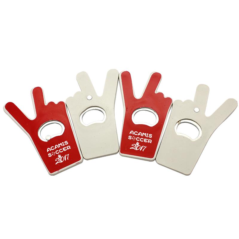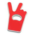 Magnetic bottle opener shaped like a hand in a peace sign (11 x 7cm).