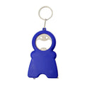 Smiling man-shaped keychain with retractable tape measure, led light and bottle opener.