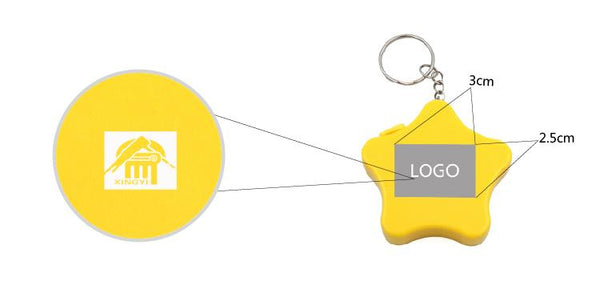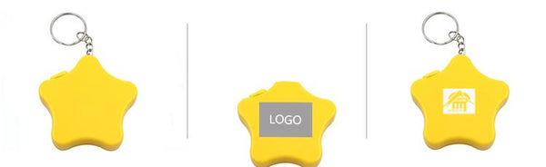 Star-shaped keychain with retractable tape measure.