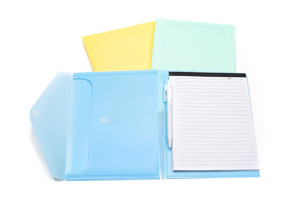 A5 Notepad with velcro-fastened side compartment consisting of 2 individual slots for filing or stationery. Writing pad is refillable. Comes assorted in 4 different colours and with 20 pages, lined.