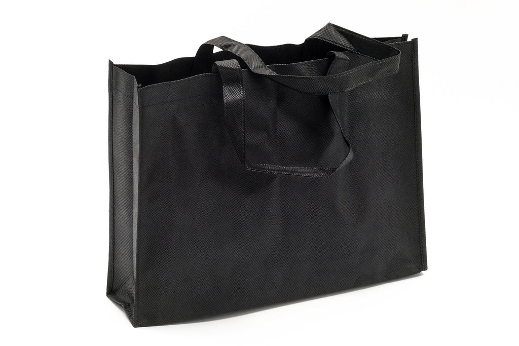 Horizontal non woven bag in black with long shoulder strap. Perfect for keeping shopping items in just one bag.