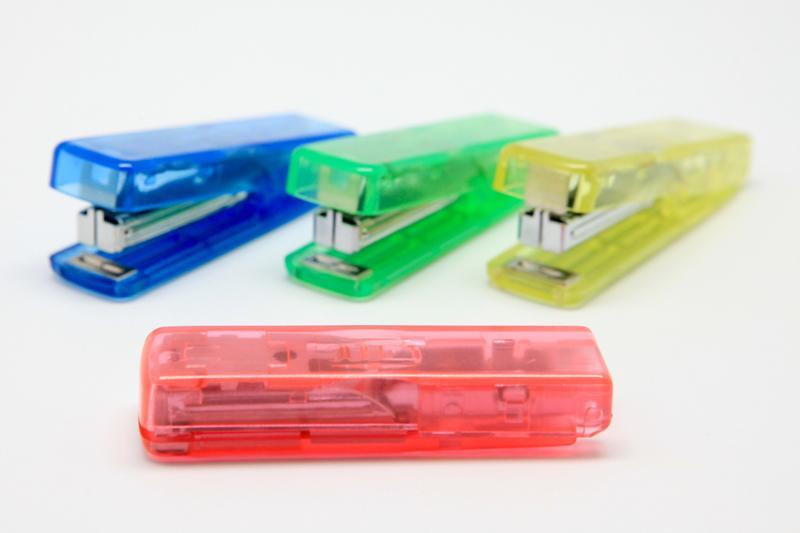 Collapsible stapler with metal inner mechanism. Simply shift top metal plate to convert from compact storage mode to use!
