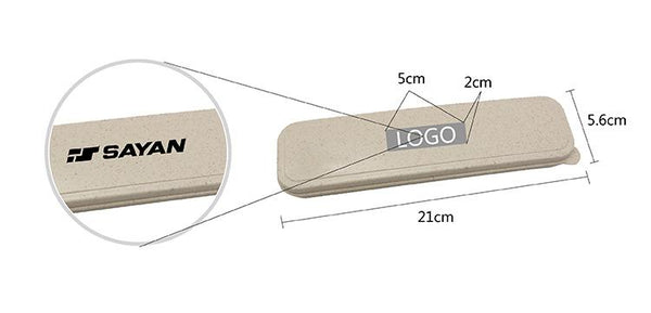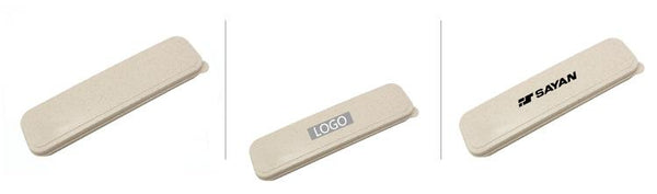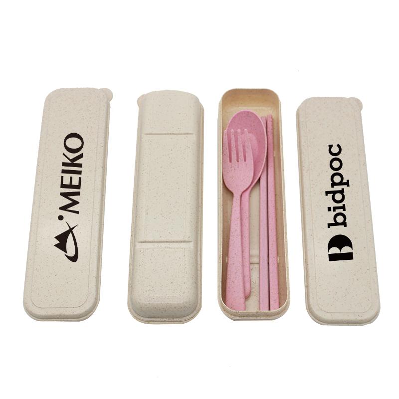 3-piece wheat fibre cutlery set in case with removable cover. Includes fork, spoon and chopsticks.