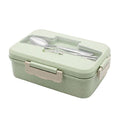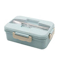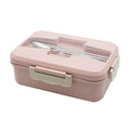Lunch box with three inner compartments. Snap lock lid includes multifunctional holder with clear cover. Comes with stainless steel chopsticks and spoon.