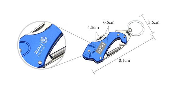 Keychain with 4-in-1 multi-tool set. includes blade, bottle opener and 2 screwdrivers.