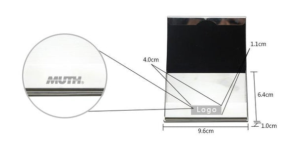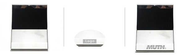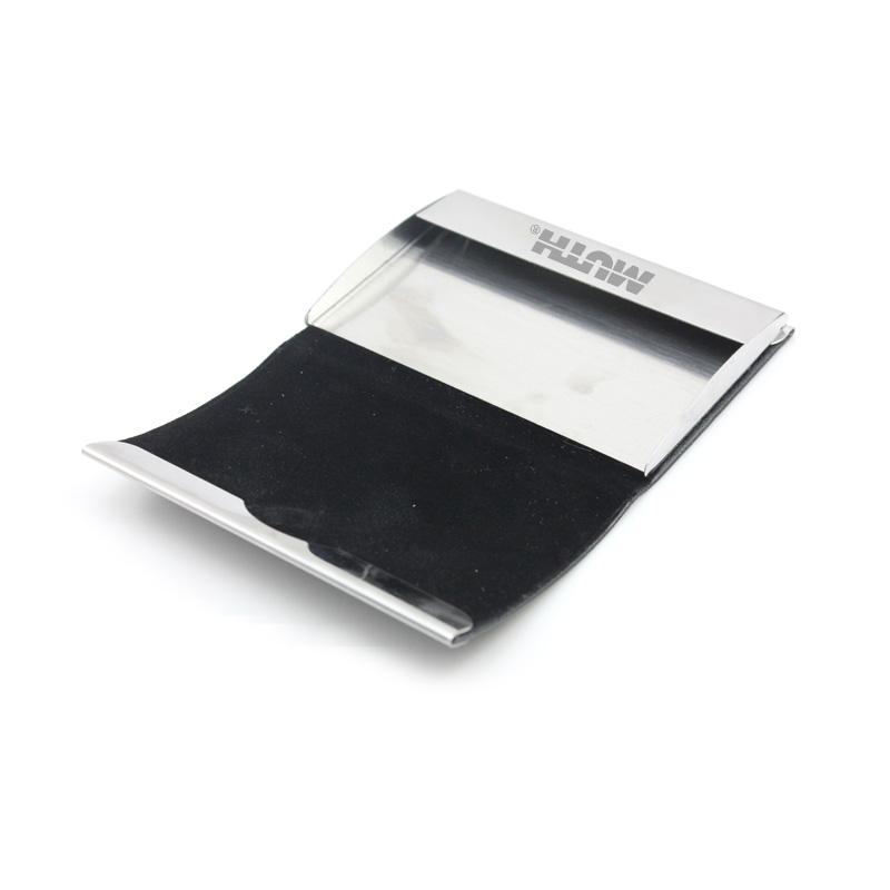 Metal name card holder in a flip-open case with textured PU leather curved cover (9.6 x 6.4cm).