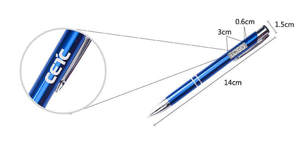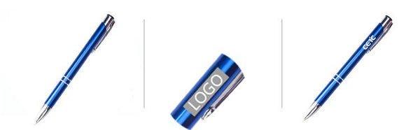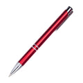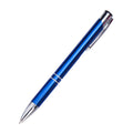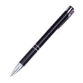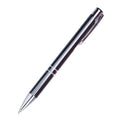 Push button ballpoint pen with silver tip and dual silver strips on body.