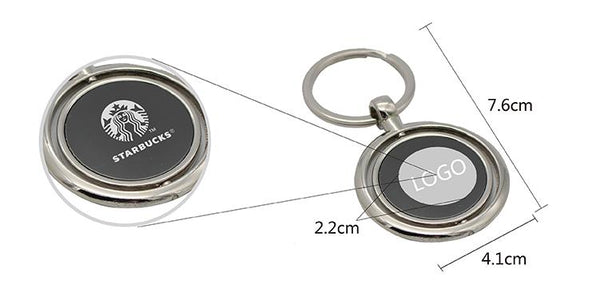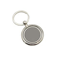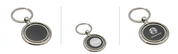 Round keychain made with zinc alloy. Includes internal rotating plate.