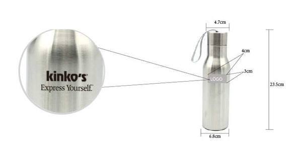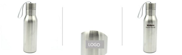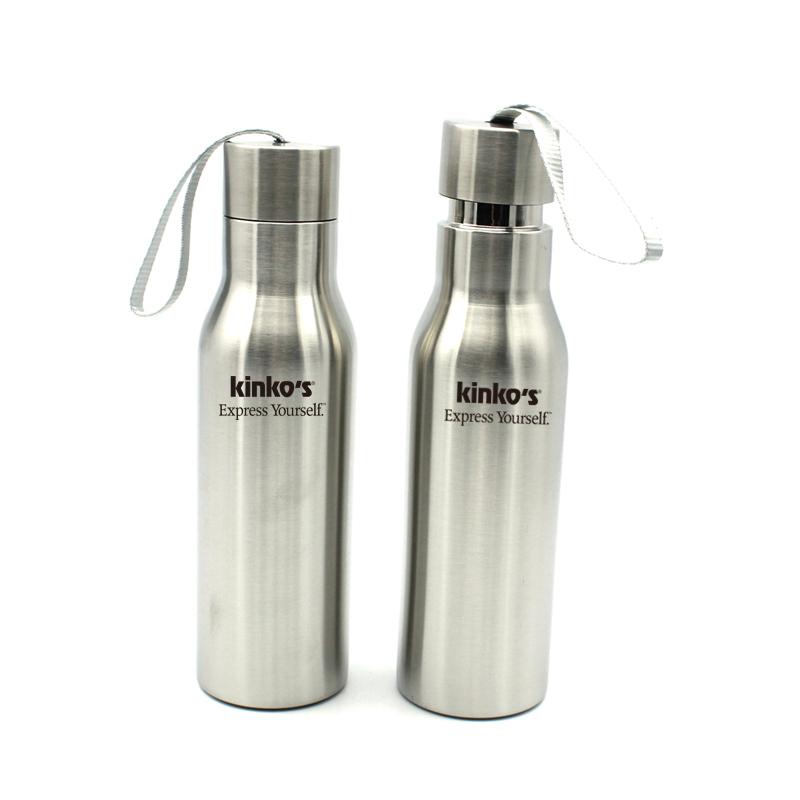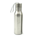 Stainless steel drinking bottle with silver body, screw cap and strap (600ml capacity).