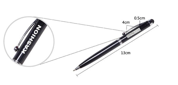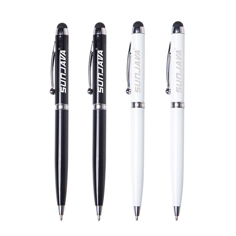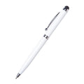 Twist-type business pen with stylus and spherical silver clip.