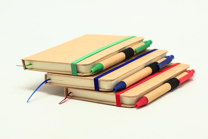 Very handy and has lined paper inside that includes an integrated bookmark colour coordinated with a tight band to hold the book shut. Pen is placed in a tab on the notebook and shaft is made of recycled material.