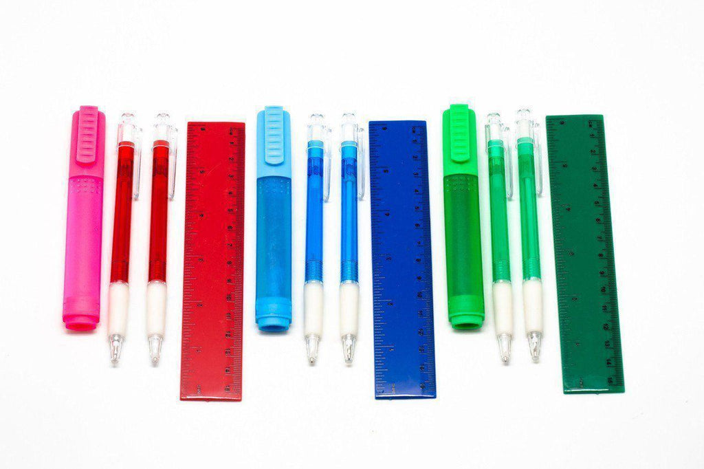 4-in-1 Set contains a ball pen, mechanical pencil, highlighter and ruler in colour co-ordinated sets. Colour varies from pink, green, blue, yellow.