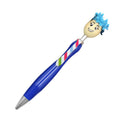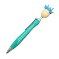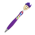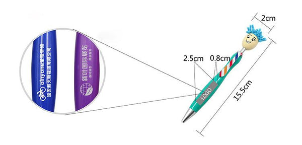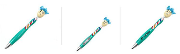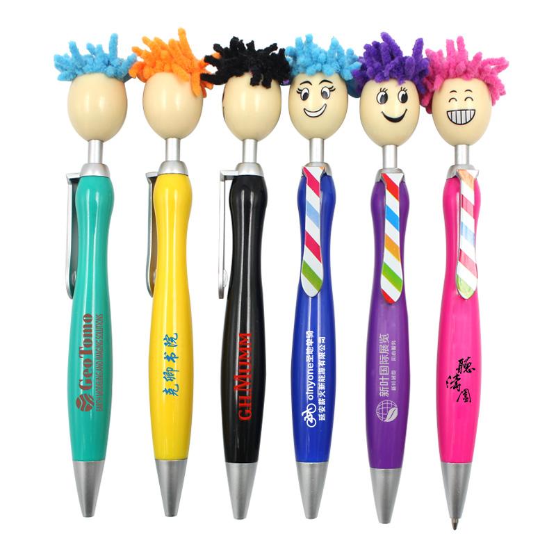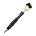 Ballpoint pen with smiling puppet head and hair on push button.