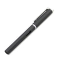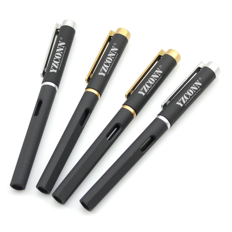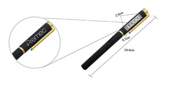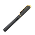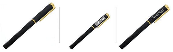 Business gel pen with black body and gold or silver clip and ink-level window.