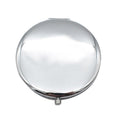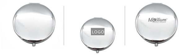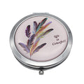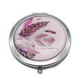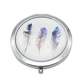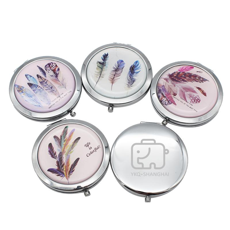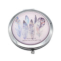 Compact round flipcase folding mirror with feather designs on cover.