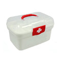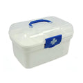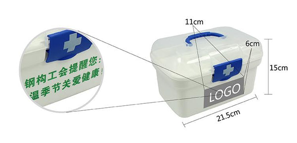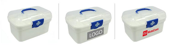 Small first aid kit made of plastic with clear cover, handle and clasp with cross logo in red or blue. Includes removable compartment.