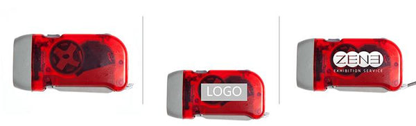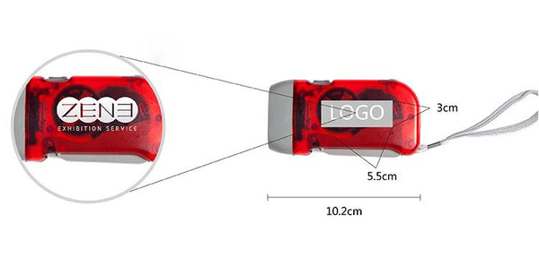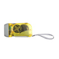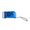 Hand press crank-powered led torch light with see-through coloured body. no batteries required.