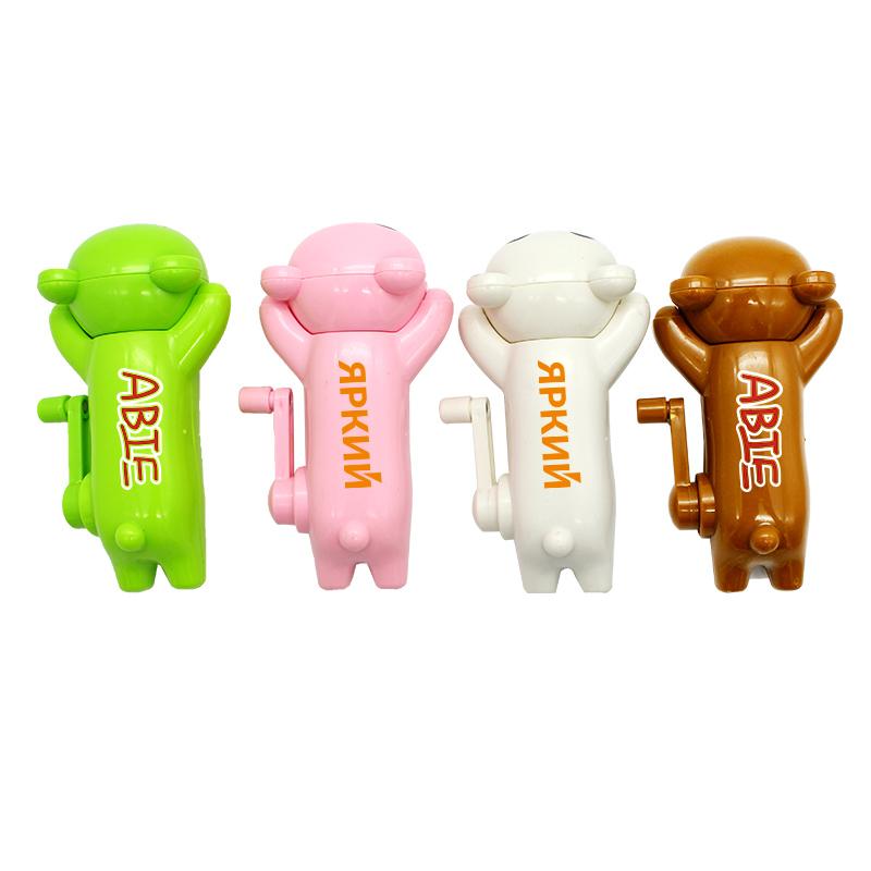 Mini hand-crank fan in cartoon design with removable protective cover in the shape of a head.