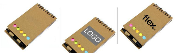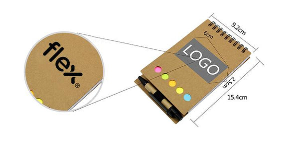Notepad with spiral bound kraft paper cover, sticky notepad, 5 sticky flag pads and mini pen.